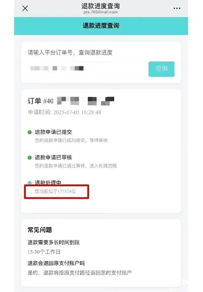 但近日,也有用户根据线上流程申请退款后发现,遭遇卖家保证金不足问题,退货停滞。甚至有网友在晒出的退款进度显示,排队位置在17万之外,预计需15-30个工作日才能到账,“目前退款申请已经通过审核,进入处理流程,当前查询退款进度显示位于177124位。”对于退款退货问题,罗马仕官方微博尚未给出明确回应。