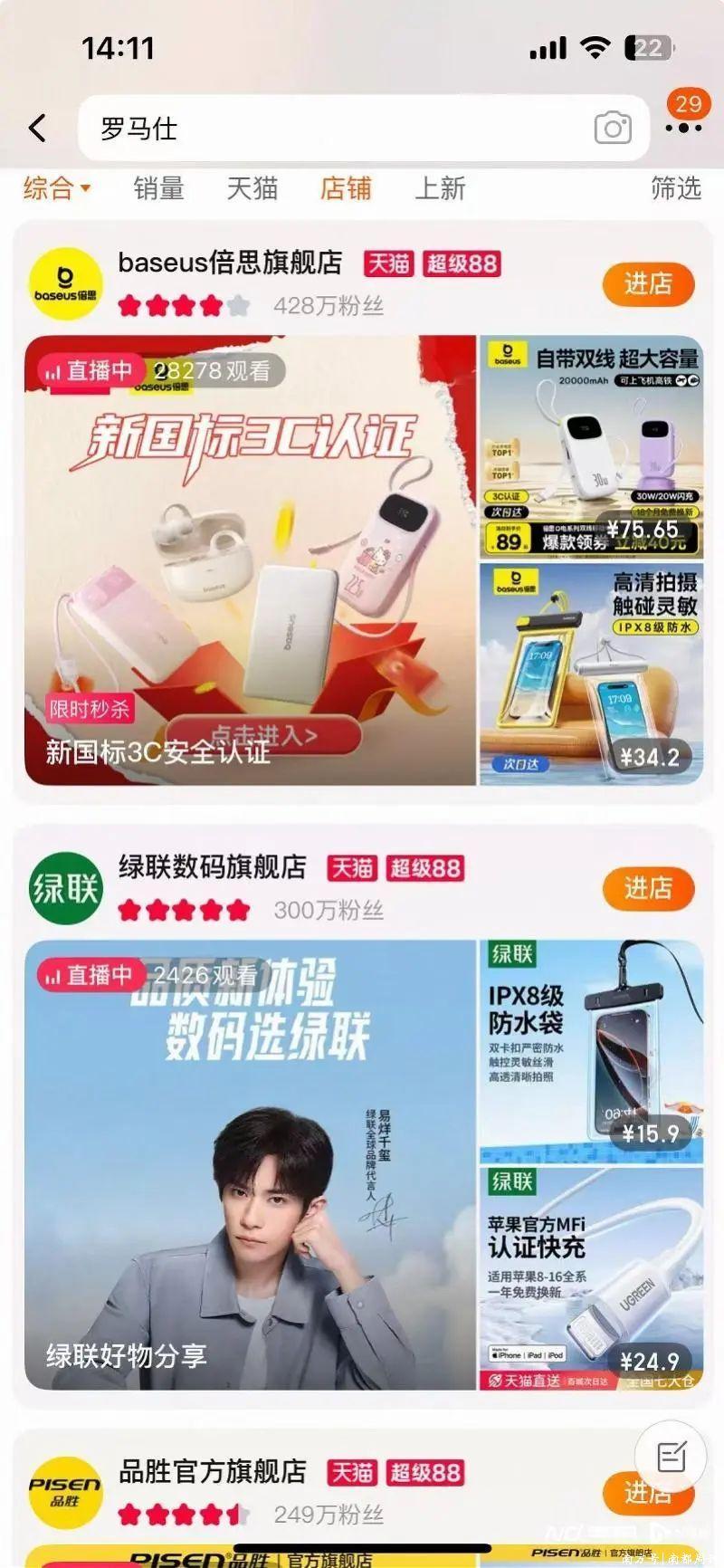 罗马仕现已关闭天猫和淘宝店铺,搜索后未出现官方店铺。