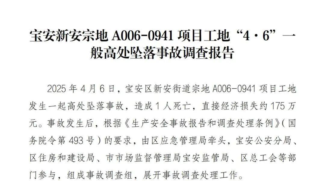 调查报告显示,2025年4月6日,宝安区新安街道宗地A006-0941项目工地发生一起高处坠落事故,造成1人死亡,直接经济损失约175万元。