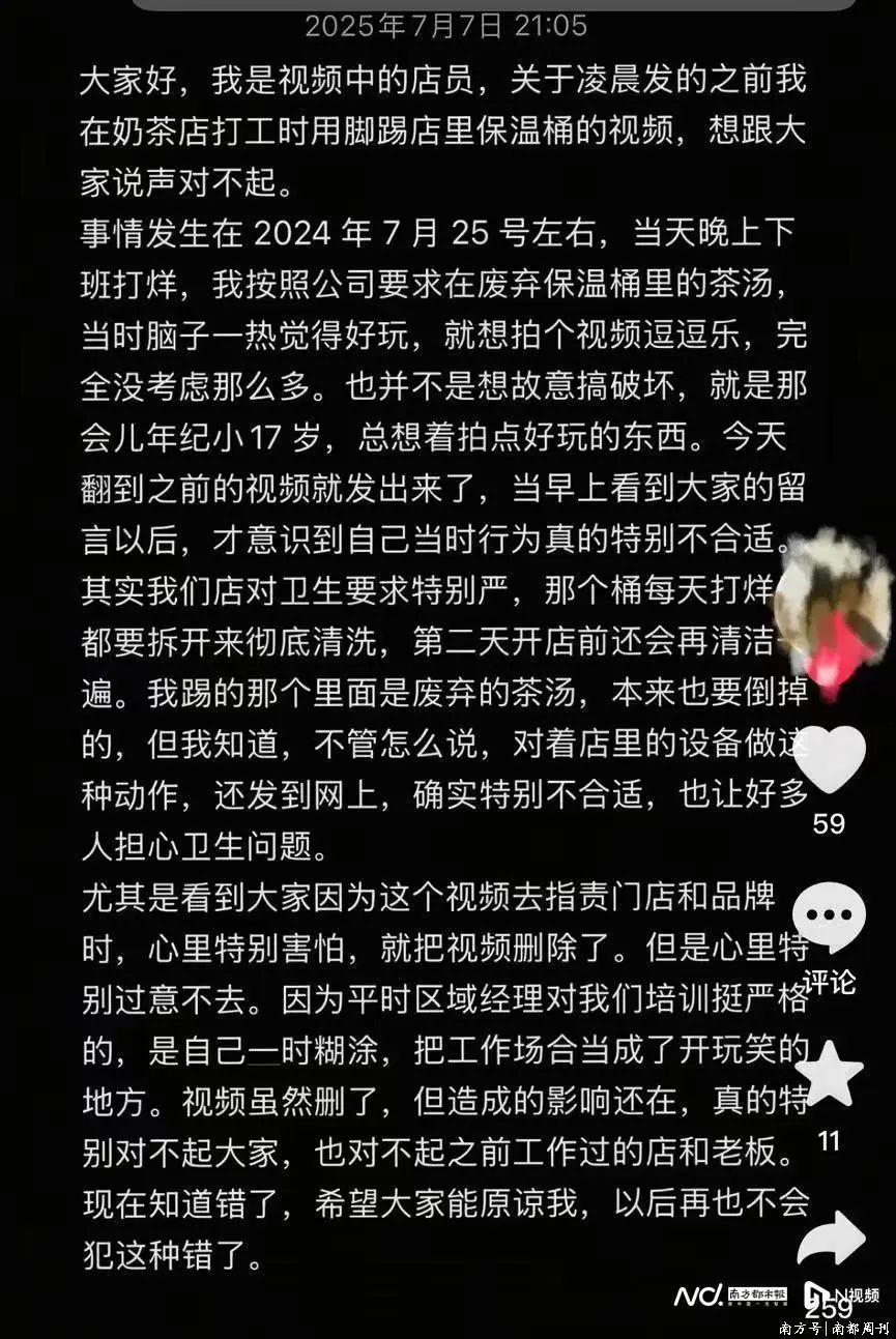 记者注意到,发布视频的网友于7月7日晚发布了对此事的回应,该网友表示,关于发布之前在奶茶店打工时用脚踢店里保温桶的视频,跟大家说声对不起。他表示,该视频拍摄在去年7月25日左右,当晚门店打烊,他没考虑那么多,想拍个视频逗逗乐,也并非有意搞破坏,“那会儿年纪还小,17岁,总想着拍点好玩的东西”。